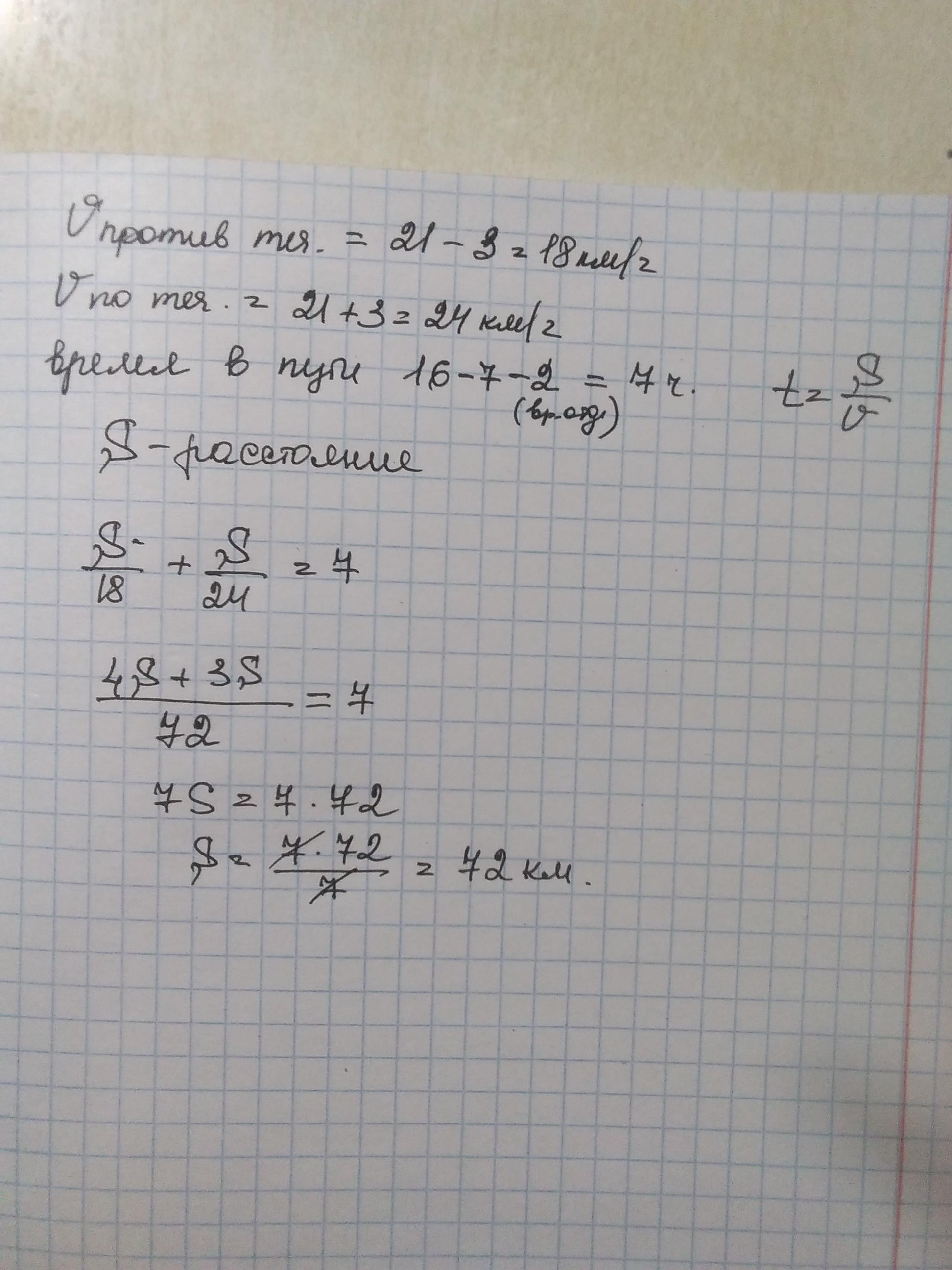 Экскурсионный катер отправился от причала А против течения реки в 7:00. Через некоторое время он высадил людей на причале Б, 2 часа стоял на перерыве и вернулся обратно к причалу А в 16:00. Найдите расстояние между причалами, если известно, что скорость течения реки 3 км/ч, а собственная скорость катера 21 км/ч.