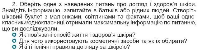 Спосіб життя, та здоров'я шкіри пов'язано напряму, наприклад, подивимося на продукти харчування. Якщо продукти натуральні та не шкідливі, й шкіра буде краще. А якщо людина не п'є достатньо води, та не їсть достатньо фруктів, овочів, тощо, то шкіра може бути жирною, або ж навпаки, сухою. Окремо треба слідкувати за своєю шкірою людям які займаються спортом, та людям які часто користуються декоративною косметикою. Догляд за шкірою дуже важливий, й треба слідкувати за ним як хлопцям, так і дівчатам.