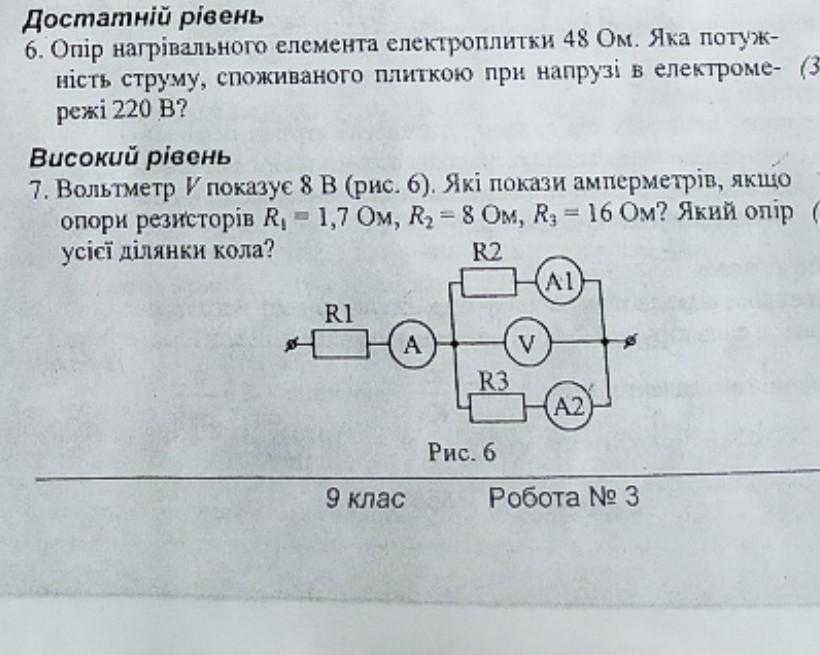 Вольметр V показує 8B.Які покази амперметрів, якщо опори резисторів R1 = 1,7 Ом , R2=8 Ом , R3= 16 Ом? Який опір усієї ділянки кола?(7)