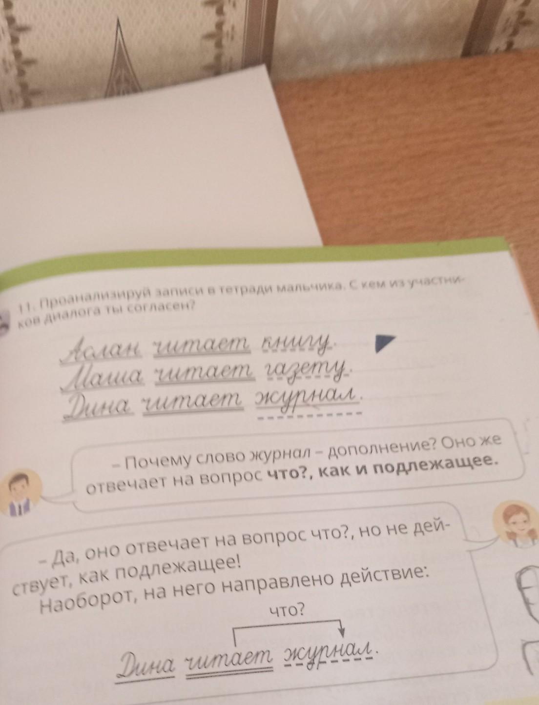 11. Проанализируй записи в тетради мальчика. С кем из участни- ков диалога ты согласен? Аслан читает книгу Маша читаем газету. Дина читает журнал. - Почему слово журнал - дополнение? Оно же отвечает на вопрос что?, как и подлежащее. w - Да, оно отвечает на вопрос что?, но не дей- ствует, как подлежащее! Наоборот, на него направлено действие: что? Duна читает журнал.