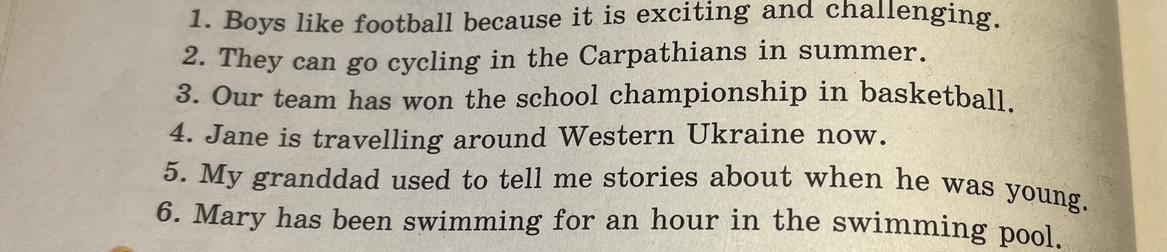 6.Mary hasn't swimming for an hour in the swimming pool