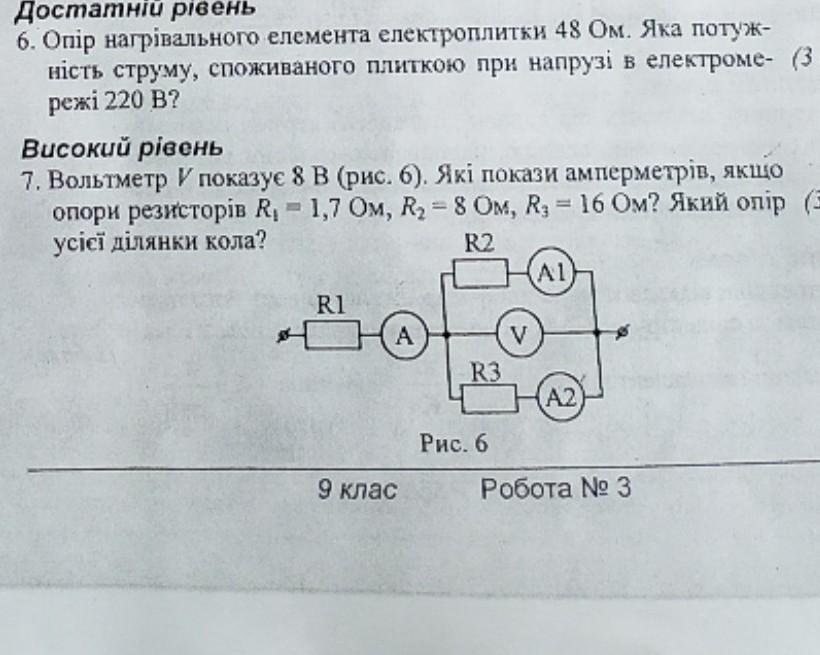 Вольметр V показує 8B.Які покази амперметрів, якщо опори резисторів R1 = 1,7 Ом , R2=8 Ом , R3= 16 Ом? Який опір усієї ділянки кола?(7)
