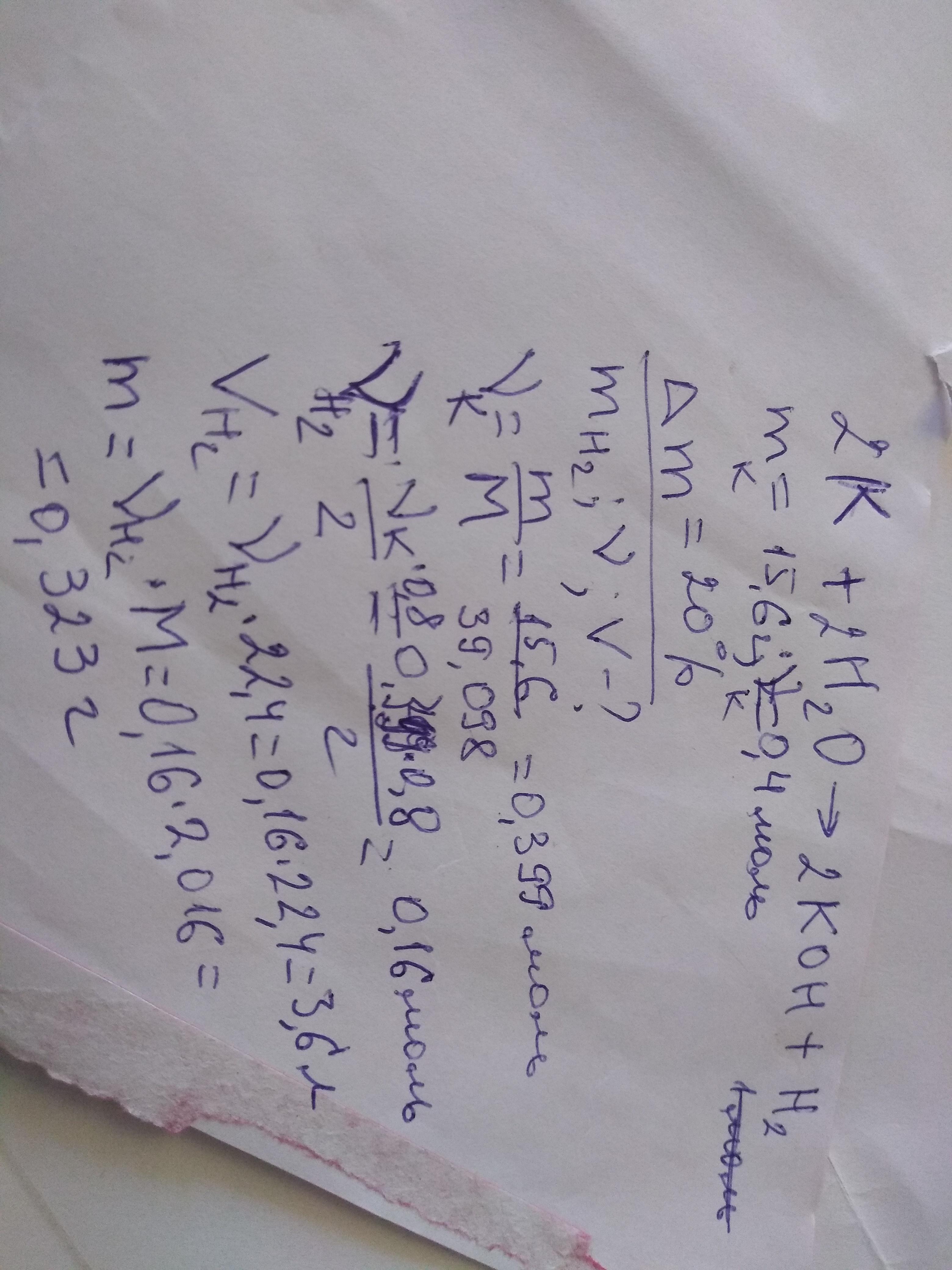 Рассчитайте количество вещества, объём и массу газа, полученного при взаимодействии 15,6 г калия с водой, если потери составляют 20%.