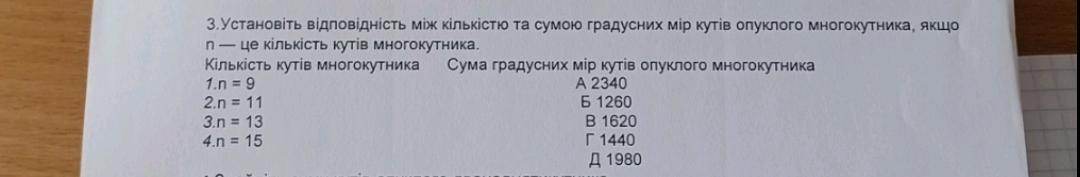 3. n=13, 180°(13-2)=1980°; відповідь Д