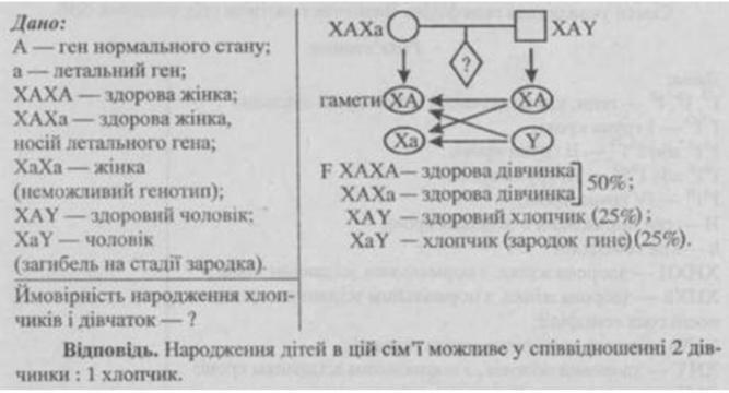 Яка ймовірність народження хлопчиків і дівчаток у сім’ї, у якій мати — носій рецесивного летального гена, зчепленого зі статтю, що визначає загибель зародка на ранніх стадіях розвитку?