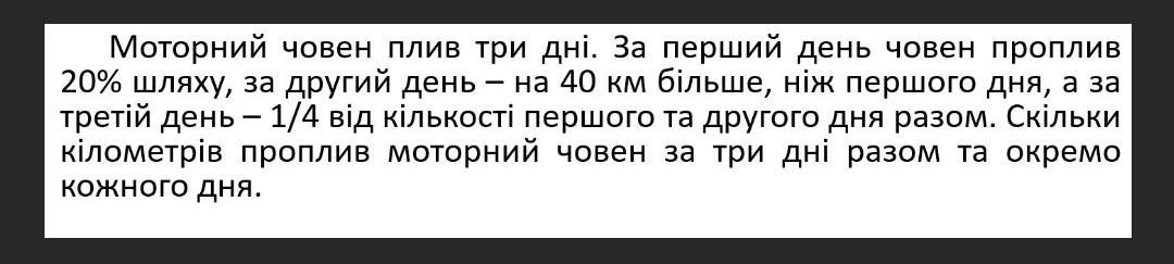 Моторний човен плив три дні. За перший день човен проплив 20% шляху, за другий день - на 40 км більше, ніж першого дня, а за третій день – 1/4 від кількості першого та другого дня разом. Скільки кілометрів проплив моторний човен за три дні разом та окремо кожного дня.