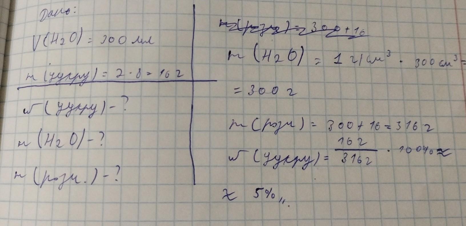 Задача: Ти зранку робиш собі чай. У 300 мл води ти кладеш 2 чайні ложки цукру. Одна чайна ложка містить 8 г цукру. Яка масова частка цукру(%) у приготованому розчині?