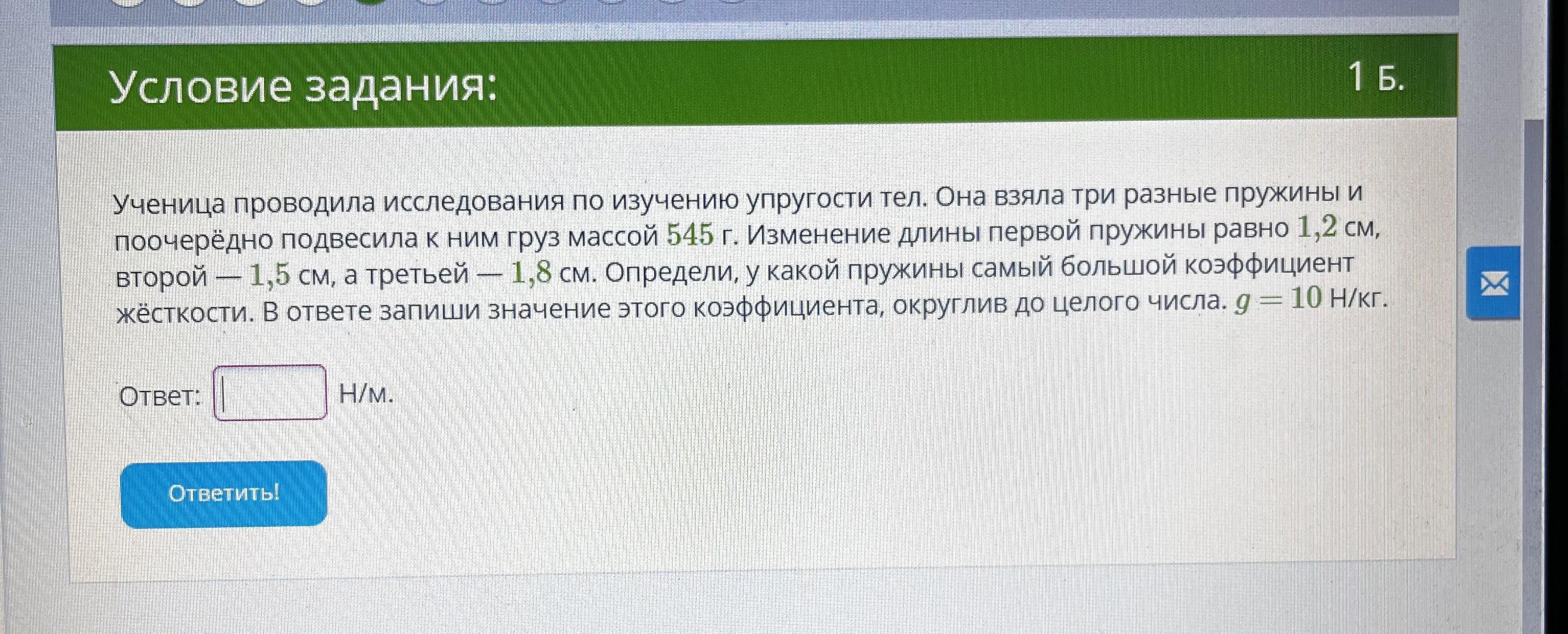 Самый большой коэффициент жесткости у первой пружины, его значение равно 449 Н/м (округляем до целого числа и ближайшего десятка). Ответ: 450.