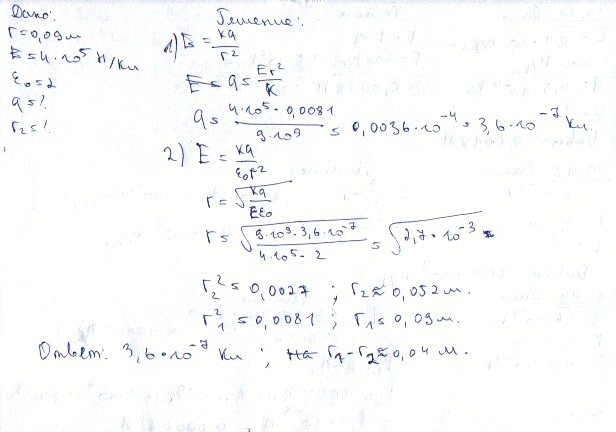 4)Определить заряд, если в вакууме на расстоянии 9,0 см от него напряженность создаваемого им поля составляет 4*10^5 Н/Кл. На сколько ближе к заряду будет находиться точка, в которой напряженность поля окажется прежней, если заряд поместить в среду с диэлектрической проницаемостью 2,0? Заряд точечный.