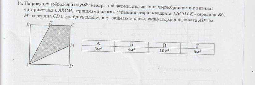 14.На рисунке изображена клумба квадратной формы, которая засеяна бархатцами в виде четырехугольника АКСМ, вершинами которого являются середины сторон квадрата ABCD (К - середина BC, М - середина CD). Найдите площадь, занимаемую цветами, если сторона квадрата АВ = 4 м.