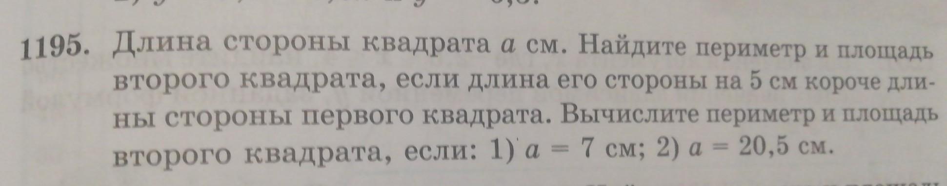 страница 127. номер 1195. Длина стороны квадрата а см. Найдите периметр и площадь второго квадрата, если длина его стороны на 5 см короче дли- ны стороны первого квадрата. Вычислите периметр и площадь второго квадрата, если: 1) а = 7 см; 2) a = 20,5 см.