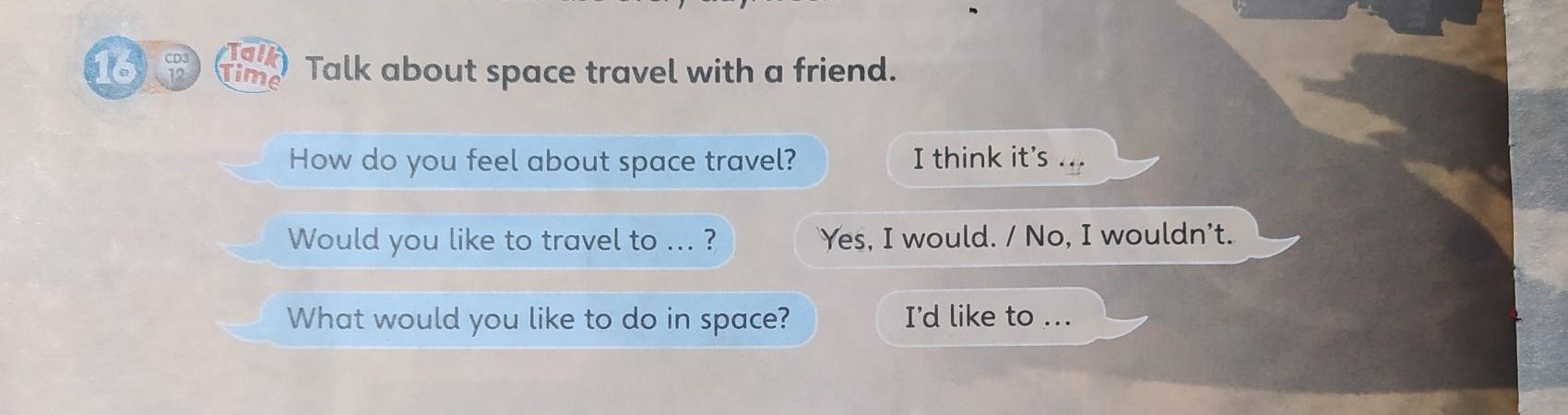 16 Talk about space travel with a friend. How do you feel about space travel? Would you like to travel to ... ? What would you like to do in space? Time I think it's ... Yes, I would. / No, I wouldn't. I'd like to ...