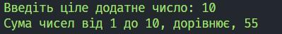 print(f'Сума чисел від 1 до {number}, дорівнює, {sum_of_numbers}')