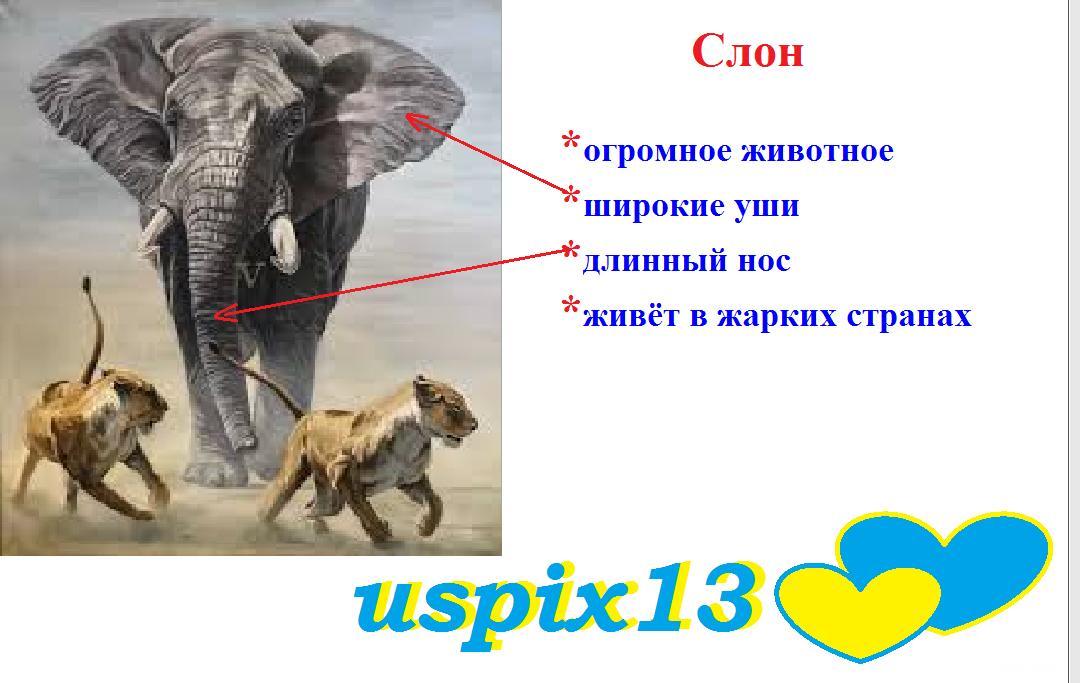В зоопарке ребята увидели огромное животное. У него широкие уши, длинный нос. Оно живёт в жарких странах.