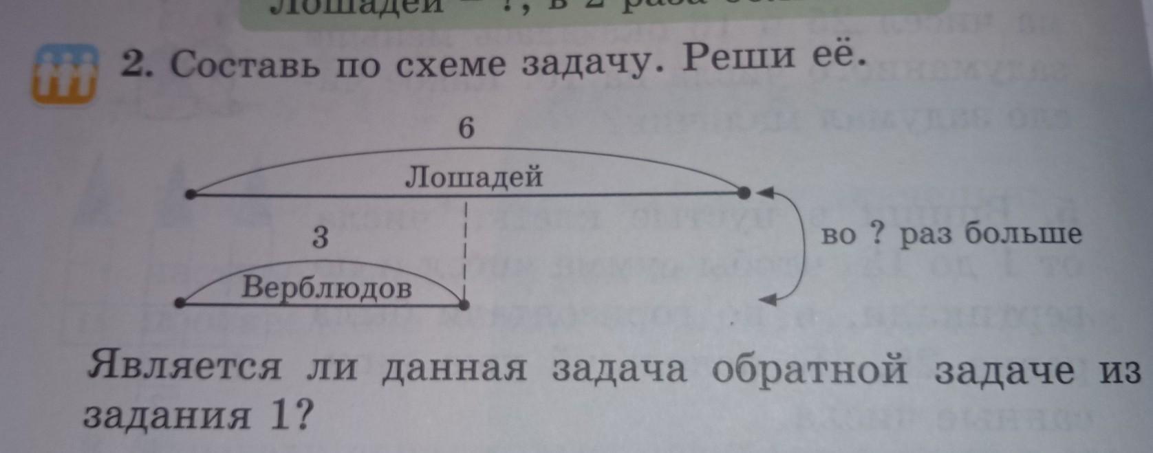 2. Составь по схеме задачу. Реши её, 6 Лошадей 3 Верблюдов ВО ? раз больше Является ли данная задача обратной задаче из задания 1?