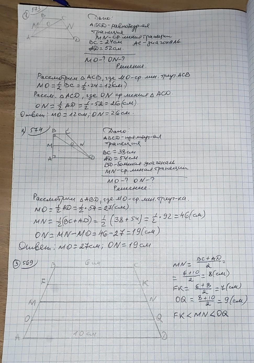номер 573. Основания равнобедренной трапеции равны 24 см и 52 см. Найди, на части какой длины диагональ трапеции разбивает ее среднюю линию.