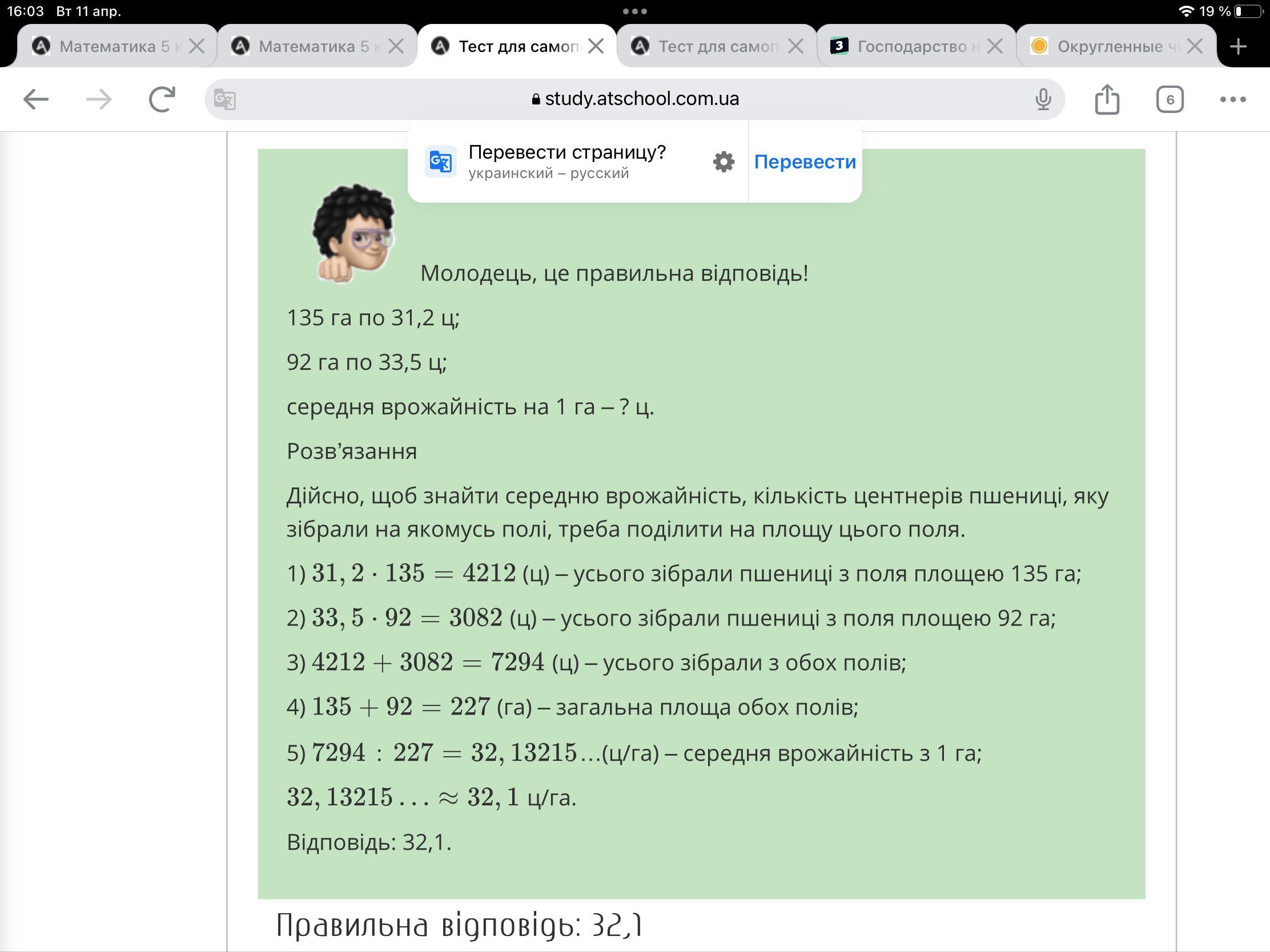 Господарство на площі 135 га зібрало по 31,2 ц пшениці з 1 га, а на площі 92 га - по 33,5 ц. Яка середня врожайність з 1 га в цьому господарстві? Відповідь округліть до десятих.