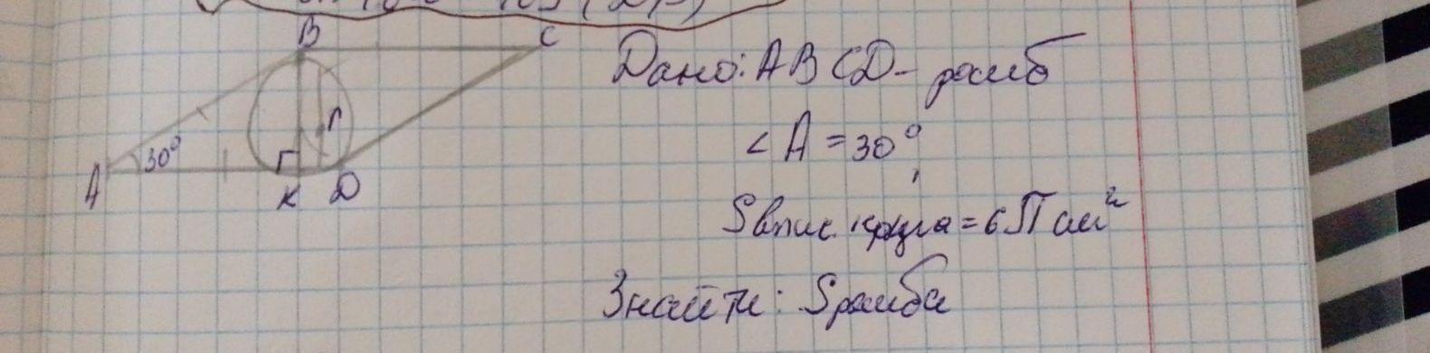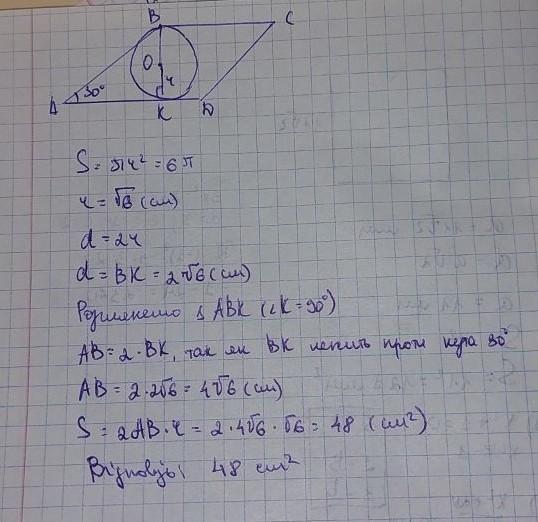 Радиус, вписанной окружности равен √6. Тогда диаметр 2√6 см. Значит ВК=2√6. Ну тогда по свойству угла в 30° , АВ=4√6. И всё стороны ромба 4√6. Площадь равна 4√6•2√6=48