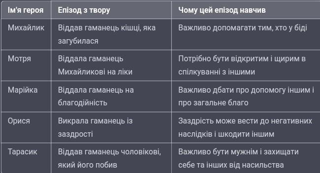 Заповнити таблицю .Обираєте героя з твору " Гаманець " ,пишете ім'я героя ,далі епізод з твору і чому цей епізод навчив. Наприклад ,Іванка віддала Риті гроші і це свідчить про її милосердя