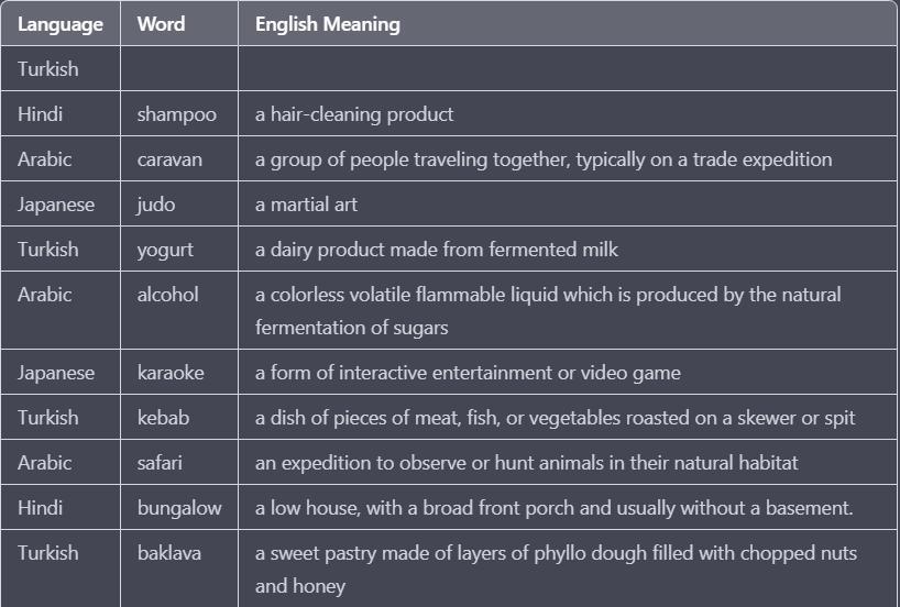 2c Complete the table with English words in the blog that originate from Turkish, Hindi, Arabic and Japanese. Then guess which of the languages the English words in the box are borrowed from and add to the table. caravan coffee judo pizza shampoo tomato .