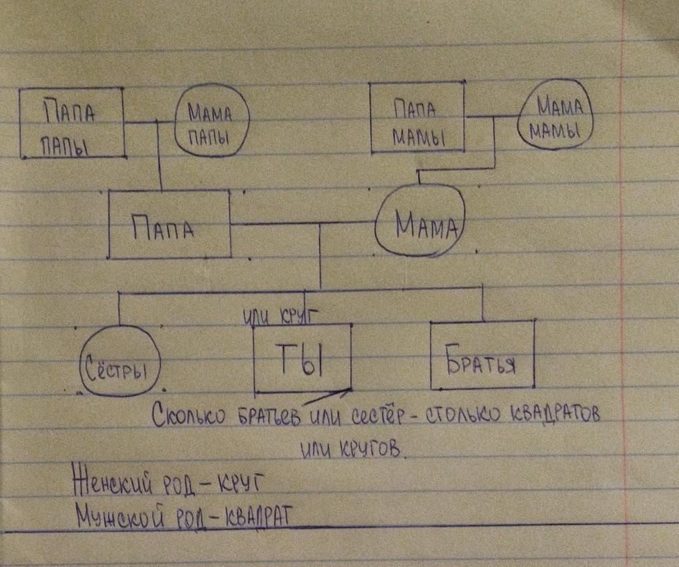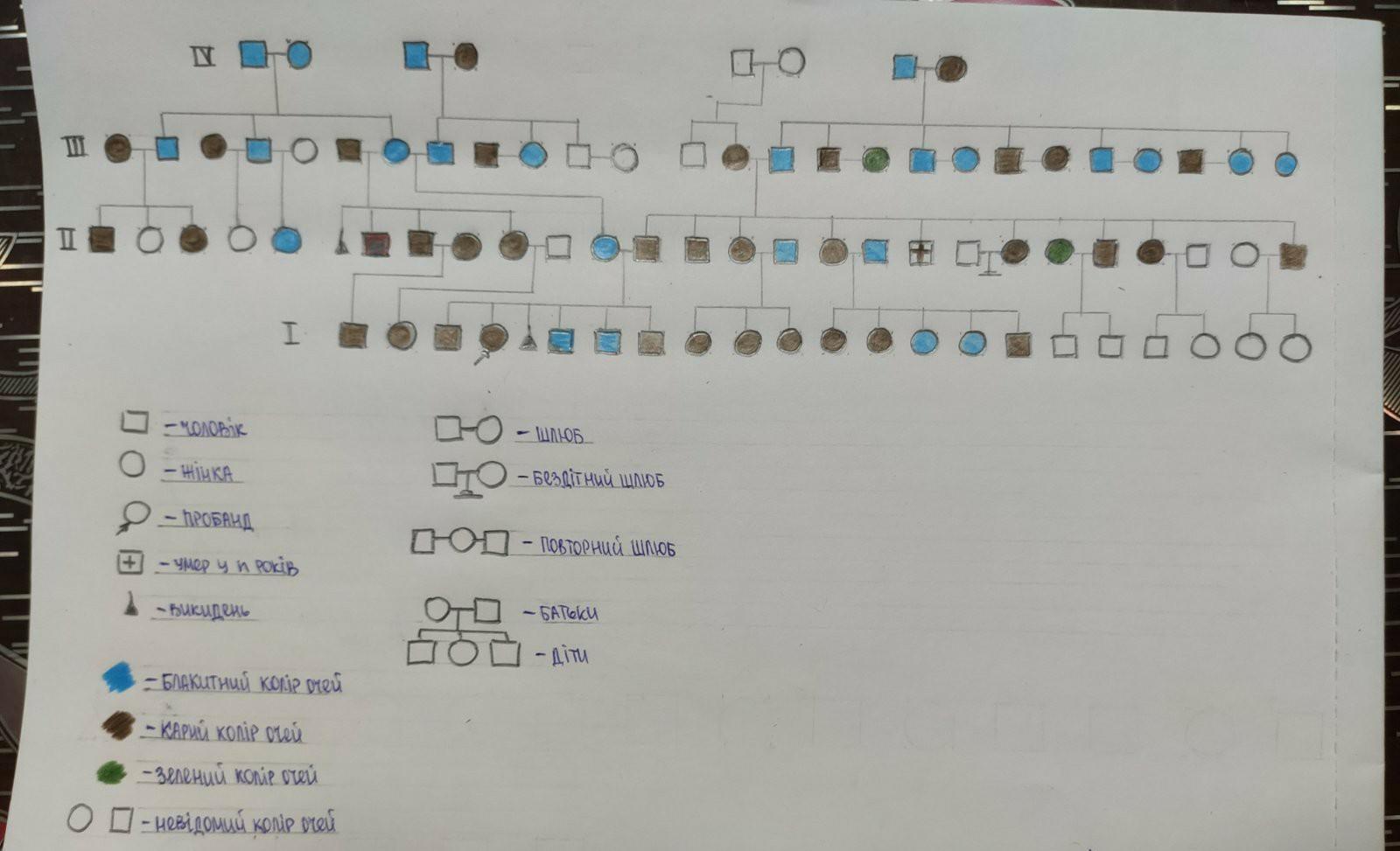 Вот, например, моё родословное по цвету глаз. Просто рисуешь себя, своих братьев, сестёр, родителей, бабушек, дедушек и расскрашиваешь тем цветом, какой есть в родословии. Голубой цвет глаз – расскрашиваешь голубым цветом, карие – коричневым и т.д.... Снизу обозначения, что не понятно – пиши, отвечу...
