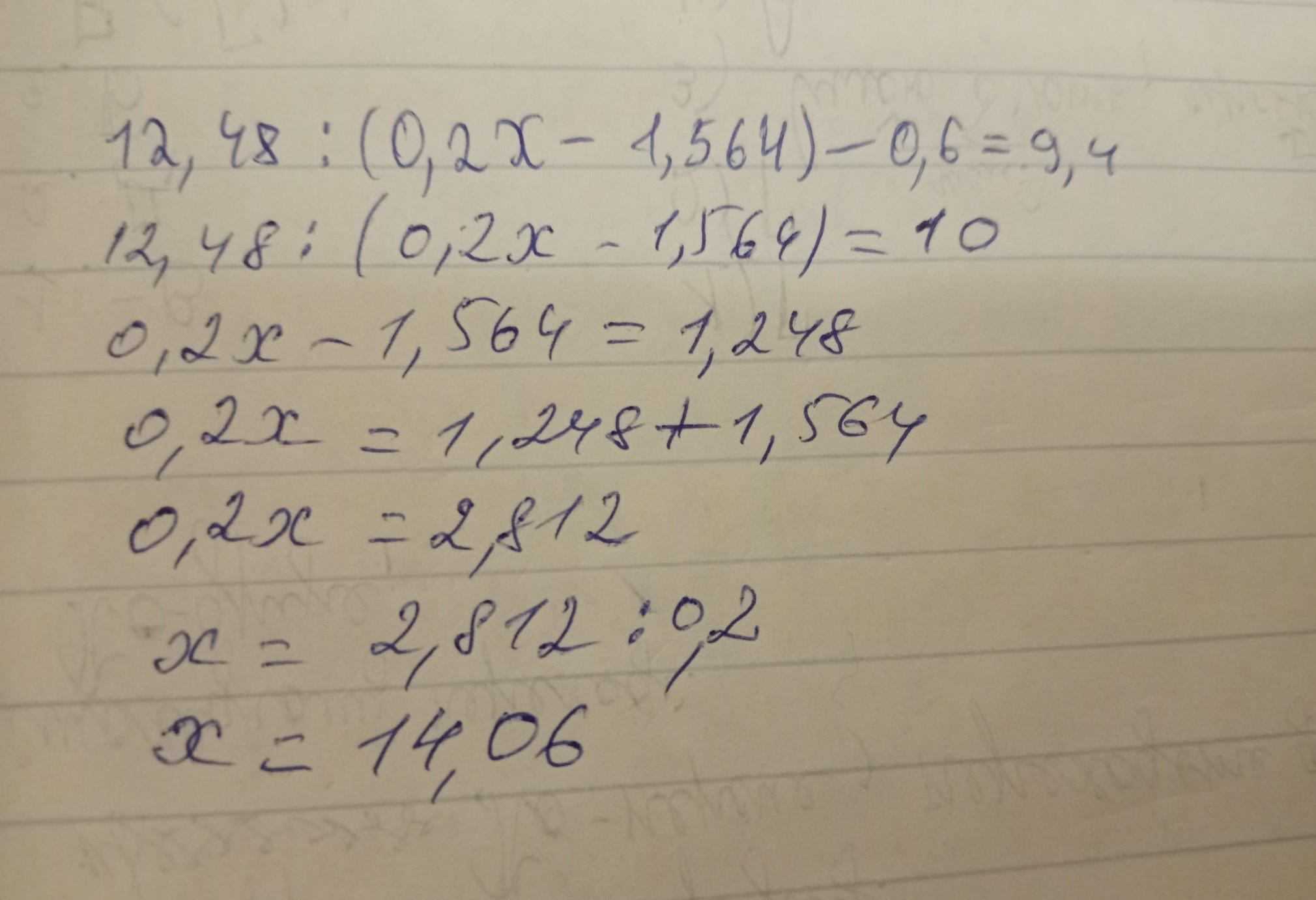 12,48 : (0,2х – 1,564) -0,6 = 9,4