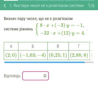 упростив систему получим х-0,375у= -0,125. затем подставляем значения координат в это уравнение проверяем равенство левой и правой частей А) 2-0,375*0≠ -0,125 неверно. Остальные правильные