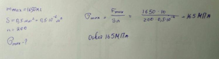 Визначте межу міцності металу, якщо виготовлений з нього канат, який складається з 10 дротин, діаметром 1 мм кожна розривається під дією вантажу масою 50 кг.