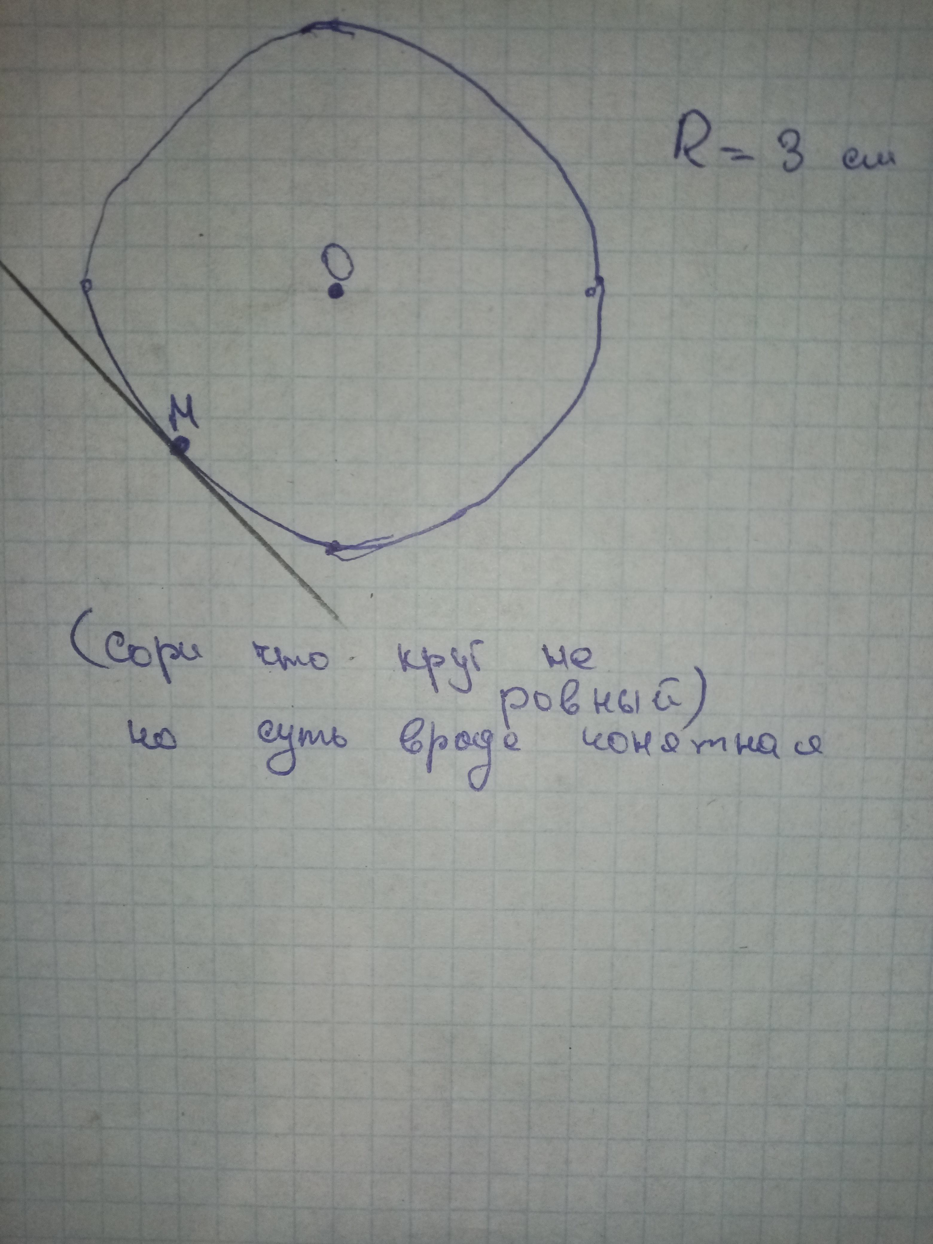 Накресліть коло радіус якого дорівнює 3 см позначте на ньому точку М. За допомогою косинця або транспортира проведіть дотичну через точку М до цього кола