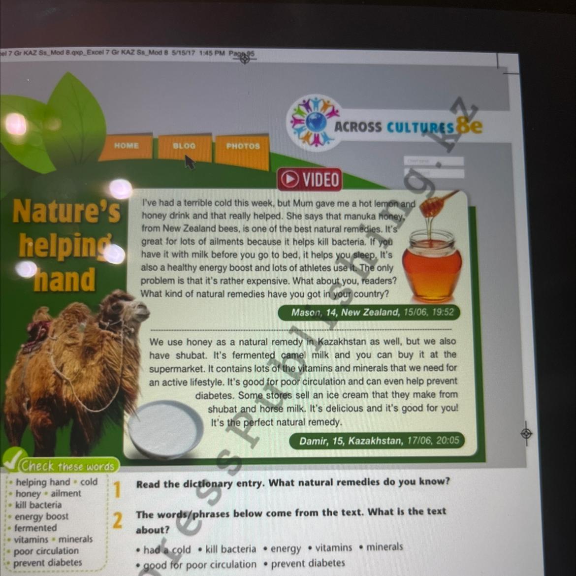 2.This text about honey. Each person describes his properties. He helped many people recover from illness. The text describes honey from two countries, Kazakhstan and New Zealand. In every country, honey is useful in some way. it has a lot of minerals, healing properties that kill bacteria. It is useful even for those people who have diabetes. In the first text, the boy talks about his experience of healing with honey! And in the second text, the boy talks about the beneficial use of honey in Kazakhstan and even hi is divided a recipe