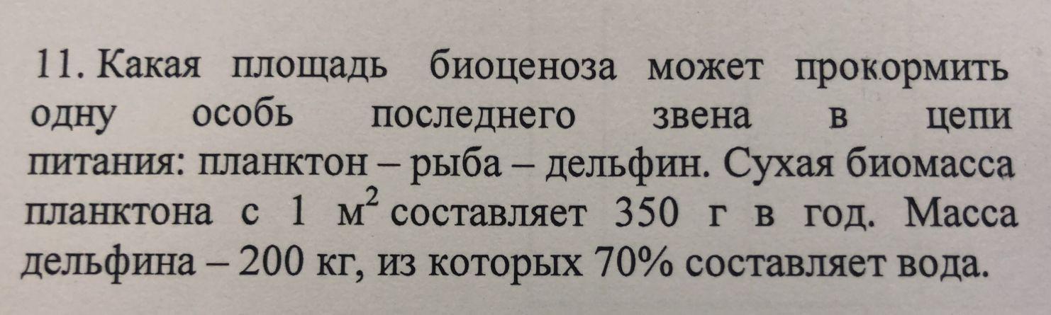 11. Какая площадь биоценоза может прокормить последнего цепи одну особь звена В питания: планктон - рыба - дельфин. Сухая биомасса планктона с 1 м² составляет 350 г в год. Масса дельфина - 200 кг, из которых 70% составляет вода.