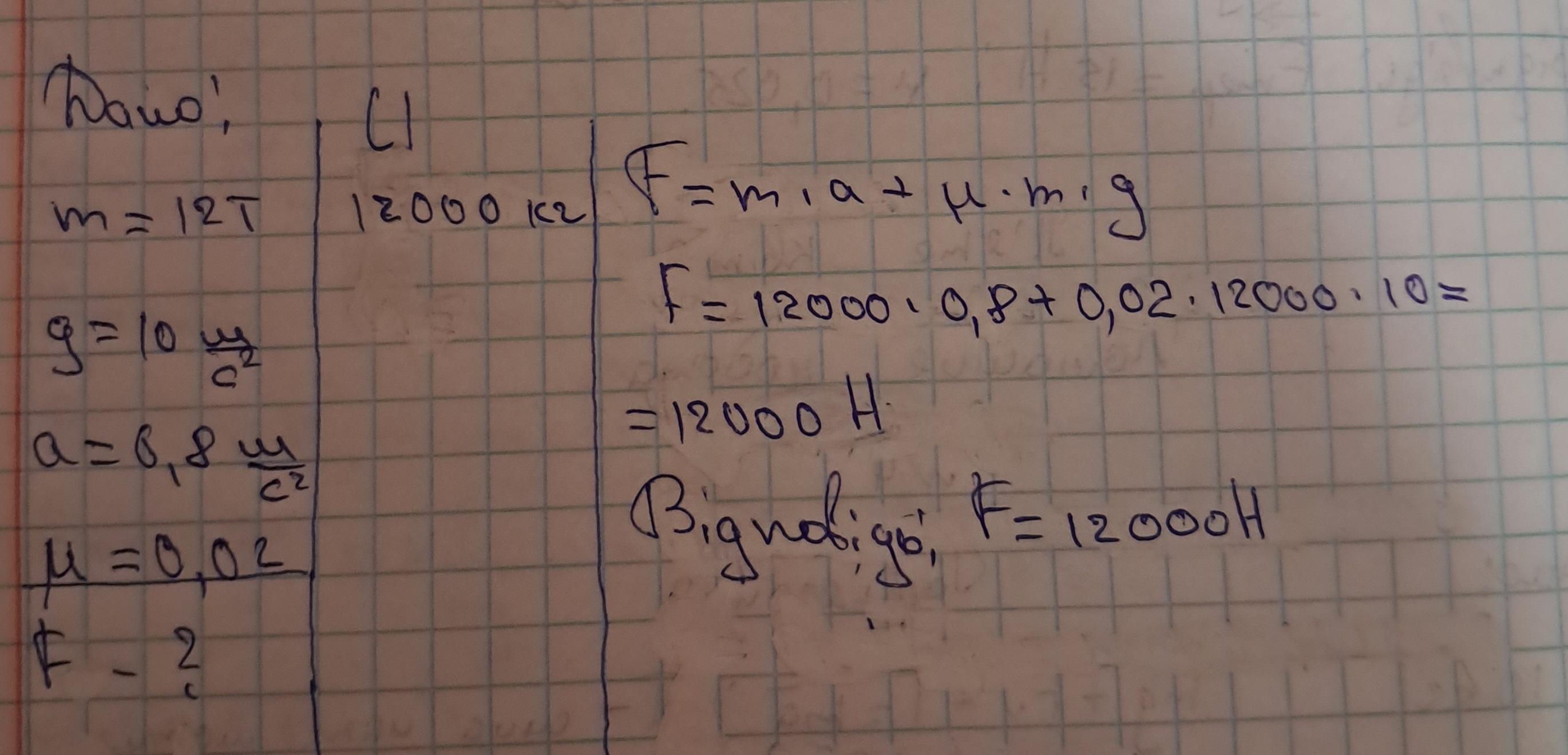 Объяснение:У мене це була правильна відповідь.Ось формула,якщо не зрозуміло на фото (F=m×a+μ×m×g)