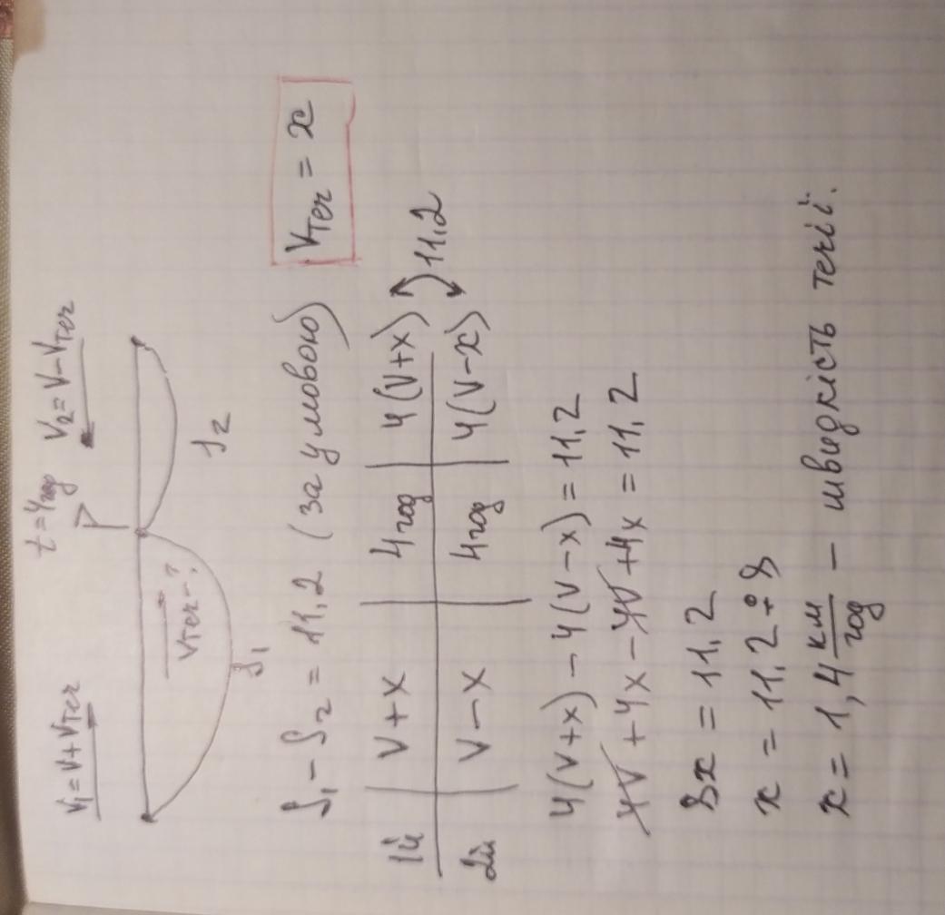 Розв’яжи задачу, склавши рівняння: Одночасно від двох пристаней назустріч один одному відійшли два моторні човни з однаковими швидкостями. Через 4 год вони зустрілися. Човен, який плив за течією, пройшов на 11,2 км більше, ніж інший човен. Обчисли швидкість течії річки.