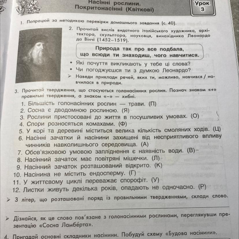 3. Прочитай твердження, що стосуються голонасінних рослин. Познач знаком «+»>