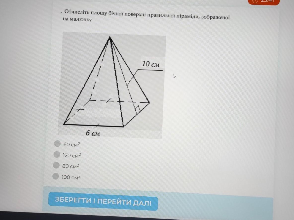 В правильной пирмиде основание квадрат, значит все стороны равны. Боковые грани соответственно тоже равны, равнобедренные треугольники. Площать треугольника равна S=*a*h, где(ребро в основании) а =6, h=10( высота ), Sтреугол=0,5*6*10=30см.кв.