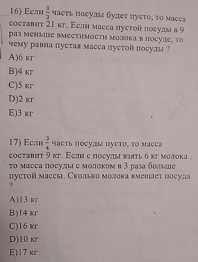 16) Пусть вместительность молока будет Х, тогда масса пустой посуды Х/9, ТОГДА Общий вес Y=X+(X/9);