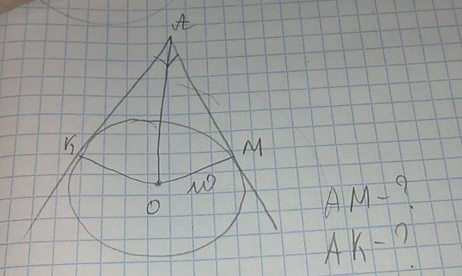 Если один угол параллелограмма прямой, то это прямоугольник. Следовательно все углы KAMO прямые. Так как ОМ=ОК=10см потому что это радиусы, то КАМО это квадрат, следовательно АМ=АК=10см