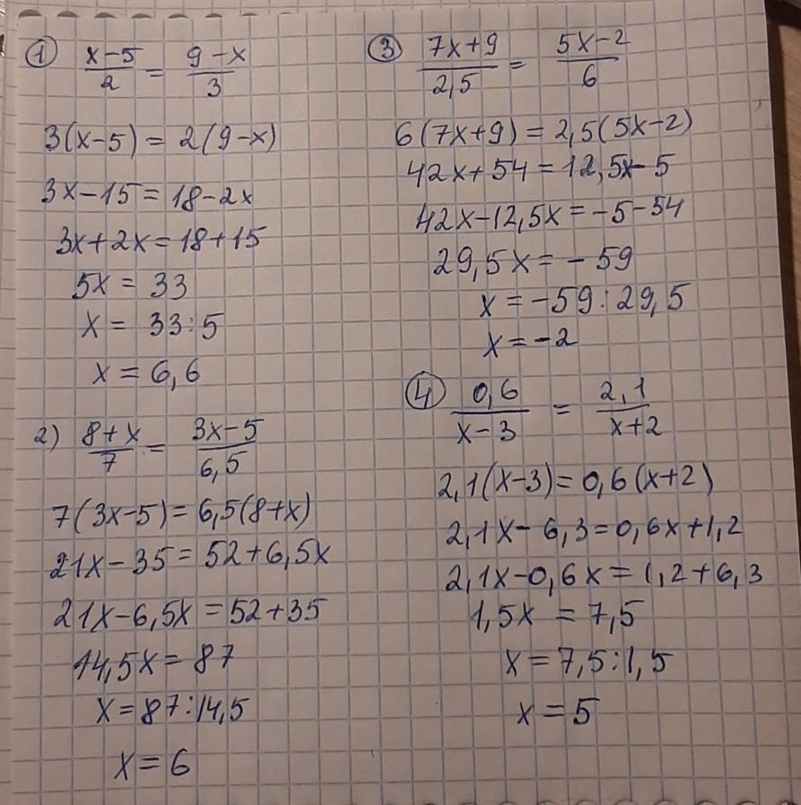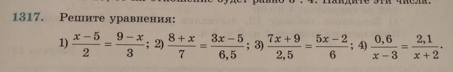 1317. Решите уравнения: x-5_9-*; 2) 8+x = 3 7 1) 2 3x-5,3) 6.5 7x+9_5x-2:4 6 2,5 0.6 x-3 2.1