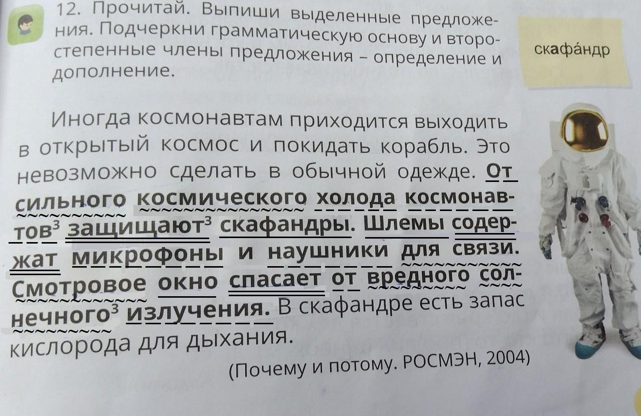 12. Прочитай. Быпиши выделенные предложе- ния. Подчеркни грамматическую основу и второ- степенные члены предложения - определение и дополнение. Иногда космонавтам приходится выходить в открытый космос и покидать корабль. Это невозможно сделать в обычной одежде. От сильного космического холода космонав- тов защищают скафандры. Шлемы содер- жат микрофоны и наушники для связи. Смотровое окно спасает от вредного сол- нечного излучения. В скафандре есть запас кислорода для дыхания. СРОЧНО