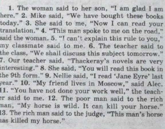 Передайте следующие повествовательные пред ложения в косвенной речи. 1. The woman said to her son, "I am glad I am here." 2. Mike said, "We have bought these books today." 3. She said to me, "Now I can read your translation." 4. "This man spoke to me on the road," said the woman. 5. "I can't explain this rule to you," my classmate said to me. 6. The teacher said to the class, "We shall discuss this subject tomorrow." 7. Our teacher said, "Thackeray's novels are very interesting." 8. She said, "You will read this book in the 9th form." 9. Nellie said, "I read 'Jane Eyre' last year." 10. "My friend lives in Moscow," said Alec. 11. "You have not done your work well," the teach- er said to me. 12. The poor man said to the rich man, "My horse is wild. It can kill your horse." 13. The rich man said to the judge, "This man's horse has killed my horse."