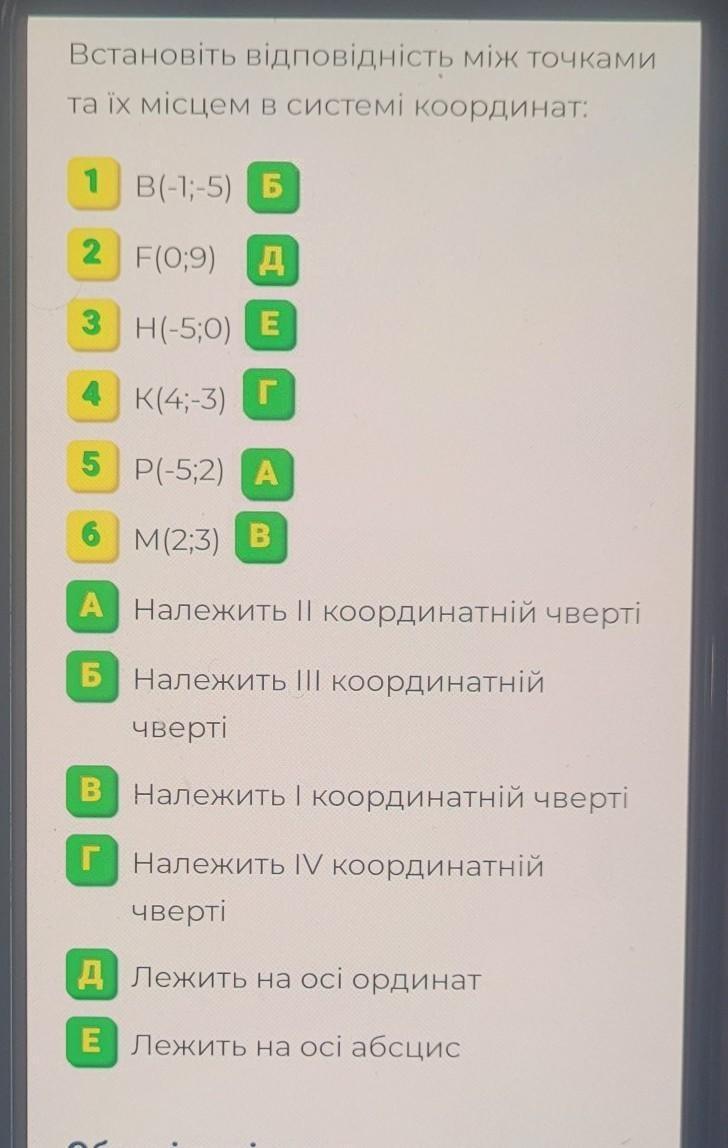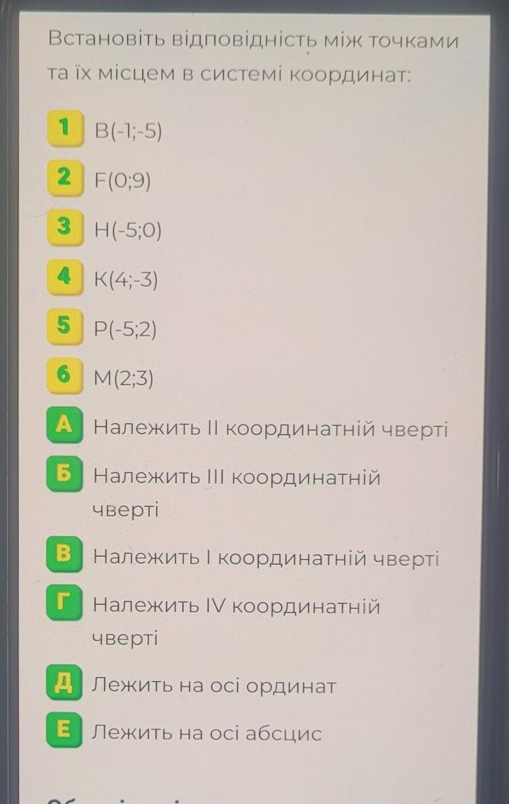 Встановіть відповідність між точками та їх місцем в системі координат: 2 3 4 B(-1;-5) F(0;9) H(-5;0) K(4;-3) 5 P(-5;2) 6 M(2;3) А Належить II координатній чверті Б Належить III координатній чверті В Належить I координатній чверті ГНалежить IV координатній чверті ДЛежить на осі ординат Е Лежить на осі абсцис