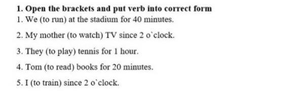 1. Open the brackets and put verb into correct form 1. We (to run) at the stadium for 40 minutes. 2. My mother (to watch) TV since 2 o'clock. 3. They (to play) tennis for 1 hour. 4. Tom (to read) books for 20 minutes. 5. I (to train) since 2 o'clock.