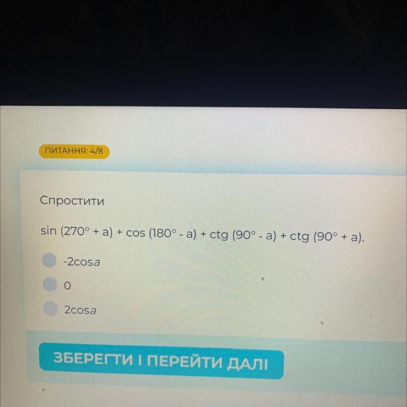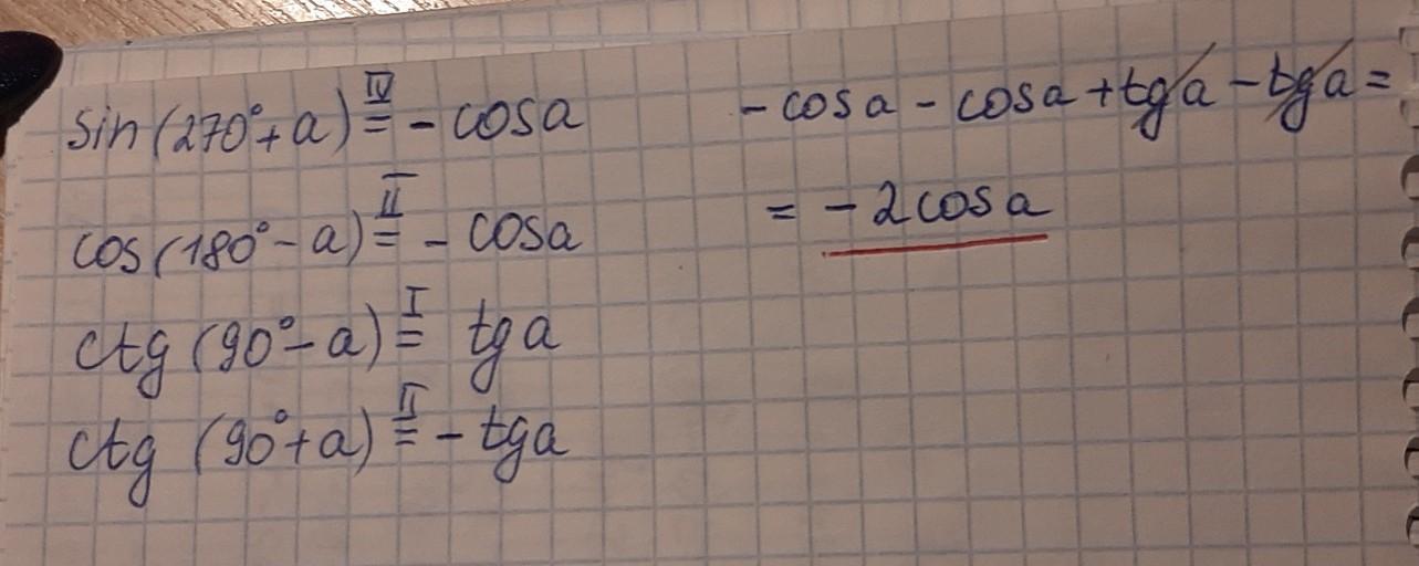 sin (270° + a) + cos (180°- a)+ ctg (90°- a)+ ctg (90° + a).