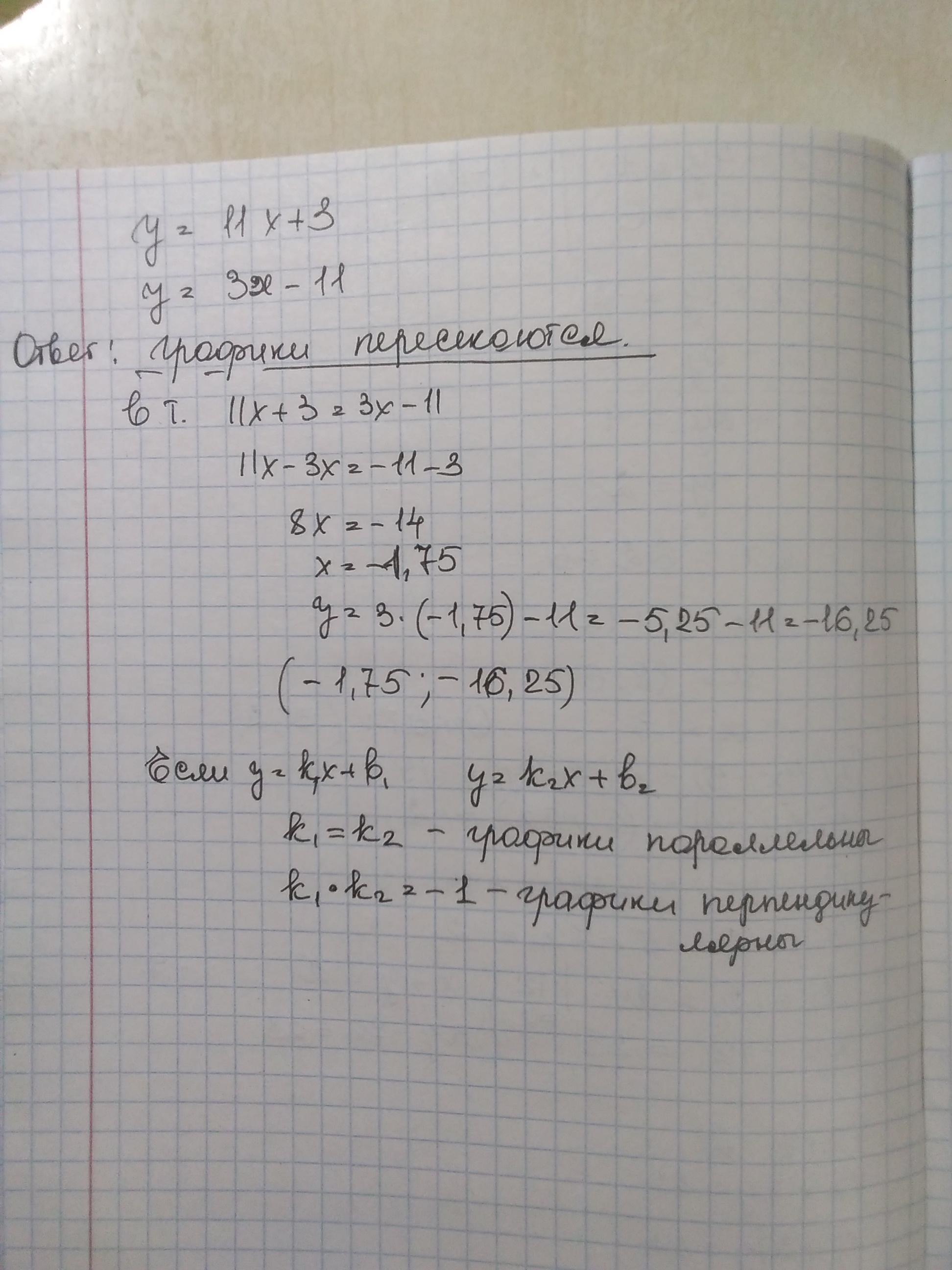 Визнач (не виконуючи побудови) взаємне розміщення графіків лінійних функцій y=11x+3 і y=3x−11.СРОЧНО ДАМ 100БАЛОВ