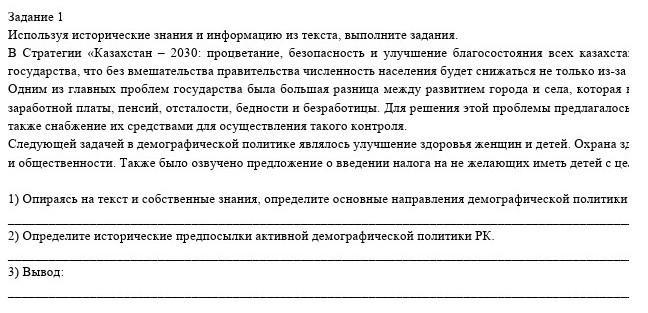 1) Опираясь на текст и собственные знания, определите основные направления демографической политики 2) Определите исторические предпосылки активной демографической политики РК. 3) Вывод:
