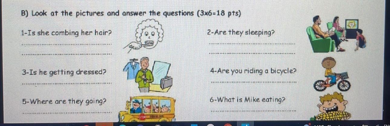 B) Look at the pictures and answer the questions (3x6-18 pts) 1-Is she combing her hair? 3-Is he getting dressed? 5-Where are they going? 2-Are they sleeping? KECHER 4-Are you riding a bicycle? 6-What is Mike eating? СРОЧНОООО!!!!!