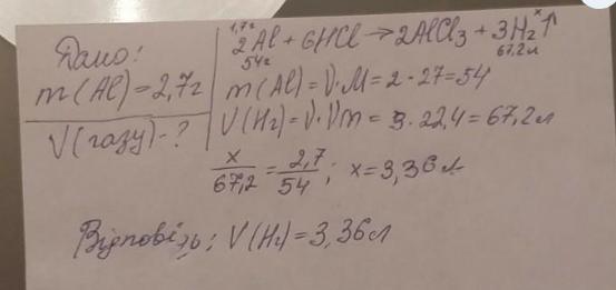 Обчисліть об’єм газу (н. у.), що виділяється при взаємодії алюмінію масою 2,7 г з достатньою кількістю сульфатної кислоти