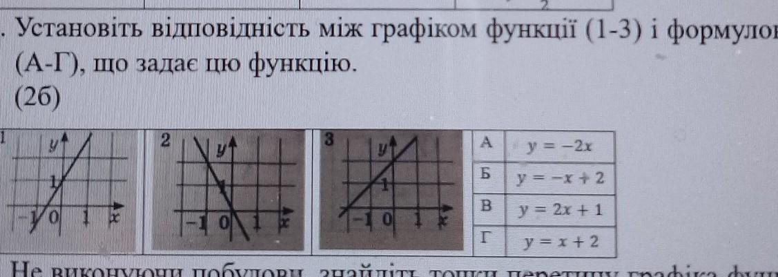 7. Установіть вiдповiднiсть мiж графіком функції (1-3) і формулою (А-Г), що задає цю функцію.