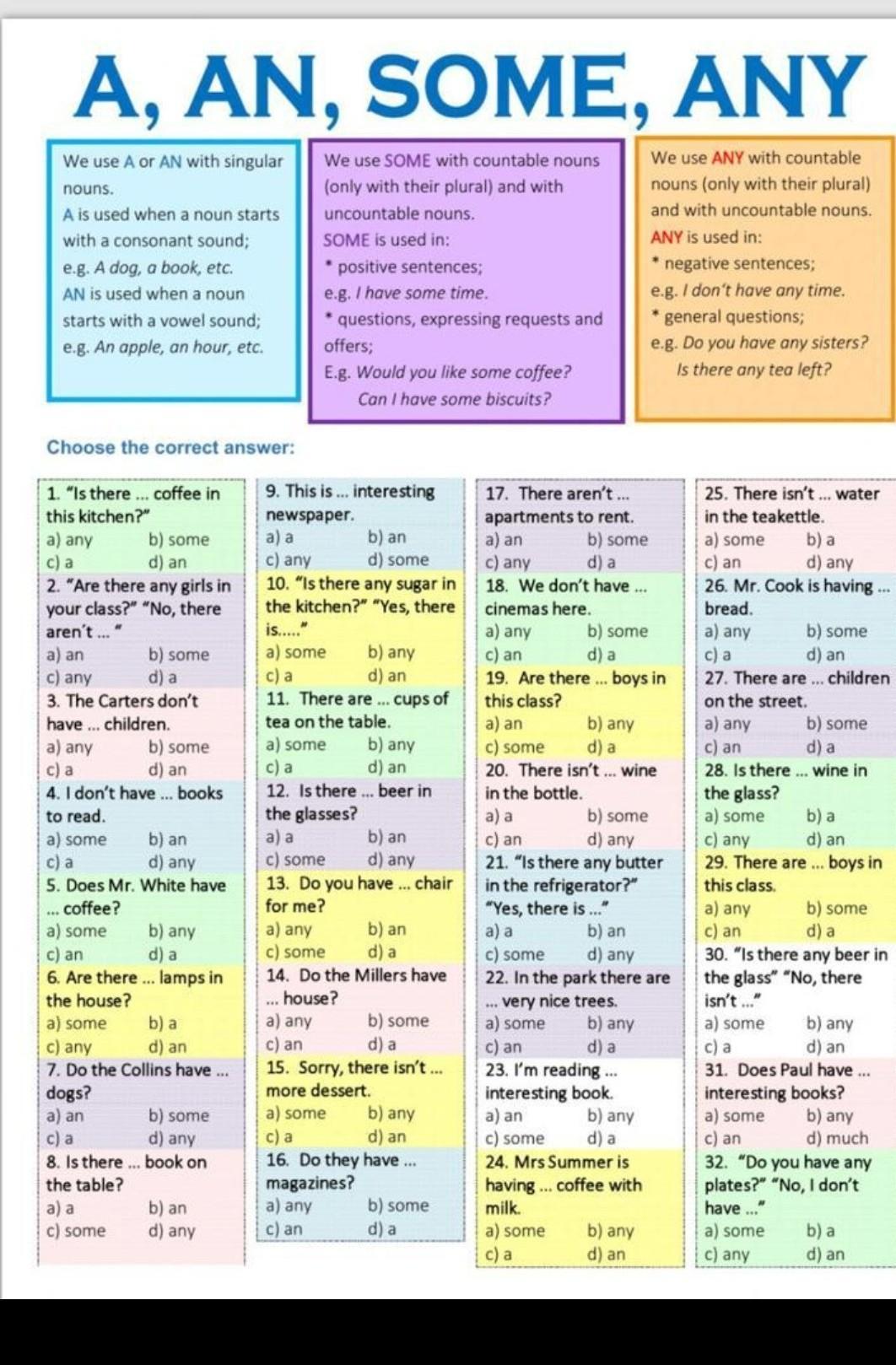 A, AN, SOME, ANY We use A or AN with singular nouns. We use SOME with countable nouns (only with their plural) and with uncountable nouns. SOME is used in: We use ANY with countable nouns (only with their plural) and with uncountable nouns. ANY is used in: A is used when a noun starts with a consonant sound; e.g. A dog, a book, etc. AN is used when a noun starts with a vowel sound; e.g. An apple, an hour, etc. Choose the correct answer: 1. "Is there... coffee in this kitchen?" a) any c) a b) some d) an 2. "Are there any girls in your class?" "No, there aren't..." a) an b) some d) a c) any 3. The Carters don't have... children. a) any c) a 4. I don't have ... books to read. b) some d) an a) some b) an c) a d) any 5. Does Mr. White have ... coffee? a) some c) an b) any d) a 6. Are there... lamps in the house? a) some b) a c) any d) an 7. Do the Collins have... a) a c) some dogs? a) an c) a 8. Is there... book on the table? b) some d) any b) an d) any * positive sentences; e.g. I have some time. * questions, expressing requests and offers; E.g. Would you like some coffee? Can I have some biscuits? 9. This is ... interesting newspaper. a) a b) an d) some c) any 10. "Is there any sugar in the kitchen?" "Yes, there is....." b) any a) some c) a d) an 11. There are... cups of tea on the table. a) some c) a 12. Is there... the glasses? a) a c) some 13. Do you for me? b) any d) an beer in a) any c) some b) an d) a 14. Do the Millers have ... house? a) any c) an b) an d) any have ... chair a) any c) an b) some d) a 15. Sorry, there isn't... more dessert. a) some c) a 16. Do they have... magazines? b) any d) an b) some d) a 17. There aren't... apartments to rent. a) an b) some c) any d) a 18. We don't have... cinemas here. a) any c) an 19. Are there... boys in this class? a) an c) some b) some d) a ... very nice trees. a) some c) an 23. I'm reading... interesting book. a) an b) any c) some d) a 24. Mrs Summer is having... coffee with milk. a) some c) a b) any d) a 20. There isn't... wine in the bottle. a) a c) an b) some d) any 21. "Is there any butter in the refrigerator?" "Yes, there is..." a) a b) an c) some d) any 22. In the park there are * b) any d) a negative sentences; e.g. I don't have any time. * general questions; e.g. Do you have any sisters? Is there any tea left? b) any d) an 25. There isn't... water in the teakettle. a) some b) a d) any c) an 26. Mr. Cook is having... bread. a) any b) some c) a d) an 27. There are... children on the street. a) any b) some c) an d) a 28. Is there... wine in the glass? a) some b) a c) any d) an 29. There are... boys in this class. b) some d) a 30. "Is there any beer in the glass" "No, there isn't..." a) some b) any d) an c) a 31. Does Paul have... interesting books? a) some c) an b) any d) much 32. "Do you have any plates?" "No, I don't have..." a) any c) an a) some c) any b) a d) an