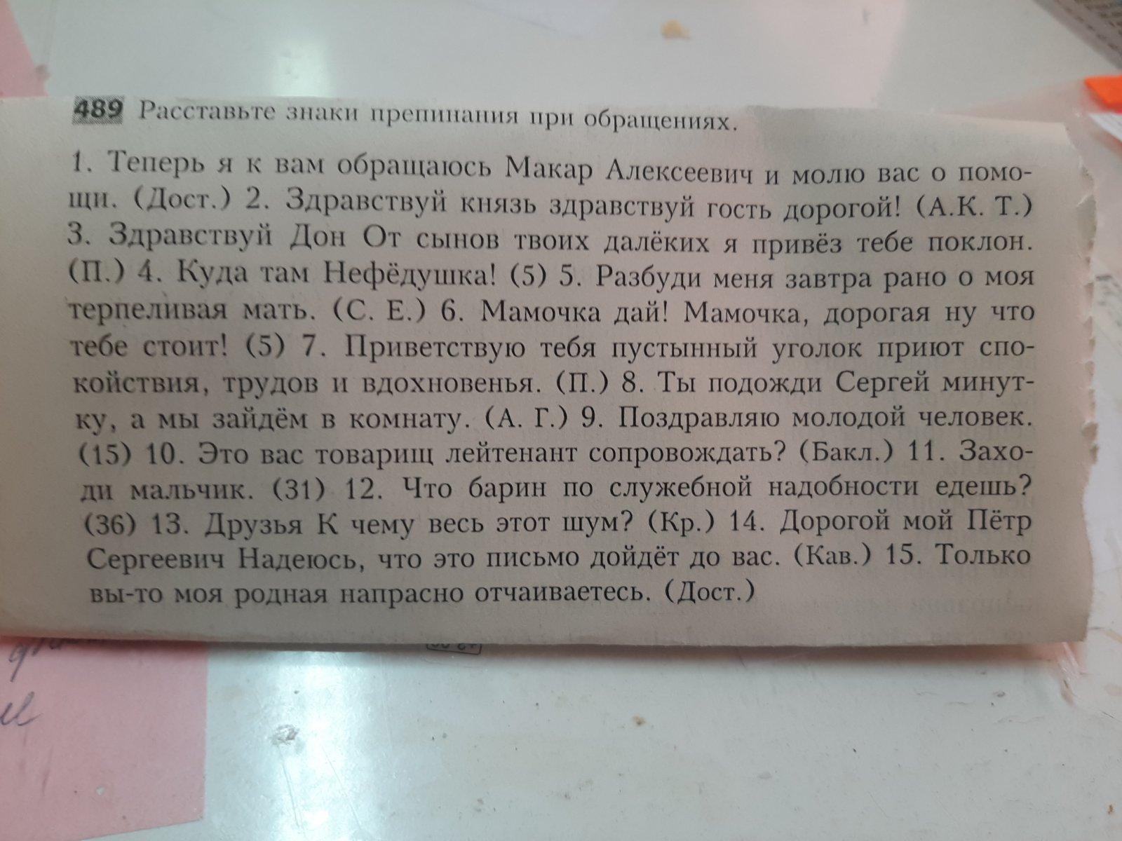 Теперь я к вам обращаюсь, Макар Алексеевич, и молю вас о помощи. (Дост.) 2. Здравствуй, князь, здравствуй, гость дорогой! (А.К. Т.)3. Здравствуй, Дон. От сынов твоих далёких я привёз тебе поклон.(П.) 4. Куда там, Нефёдушка! (5) 5. Разбуди меня завтра рано, о, моя терпеливая мать. (С. Е.) 6. Мамочка, дай! Мамочка, дорогая, ну что тебе стоит! (5) 7. Приветствую тебя, пустынный уголок, приют спокойствия, трудов и вдохновения. (П.) 8. Ты подожди, Сергей, минутку, а мы зайдём в комнату. (А. Г.) 9. Поздравляю, молодой человек.(15) 10. Это вас, товарищ лейтенант, сопровождать? (Бакл.) 11. Заходи, мальчик. (31) 12. Что, барин, по служебной надобности едешь?(36) 13. Друзья! К чему весь этот шум? (Кр.) 14. Дорогой мой Пётр Сергеевич! Надеюсь, что это письмо дойдёт до вас. (Кав.) 15. Только вы-то, моя родная, напрасно отчаиваетесь. (Дост.)